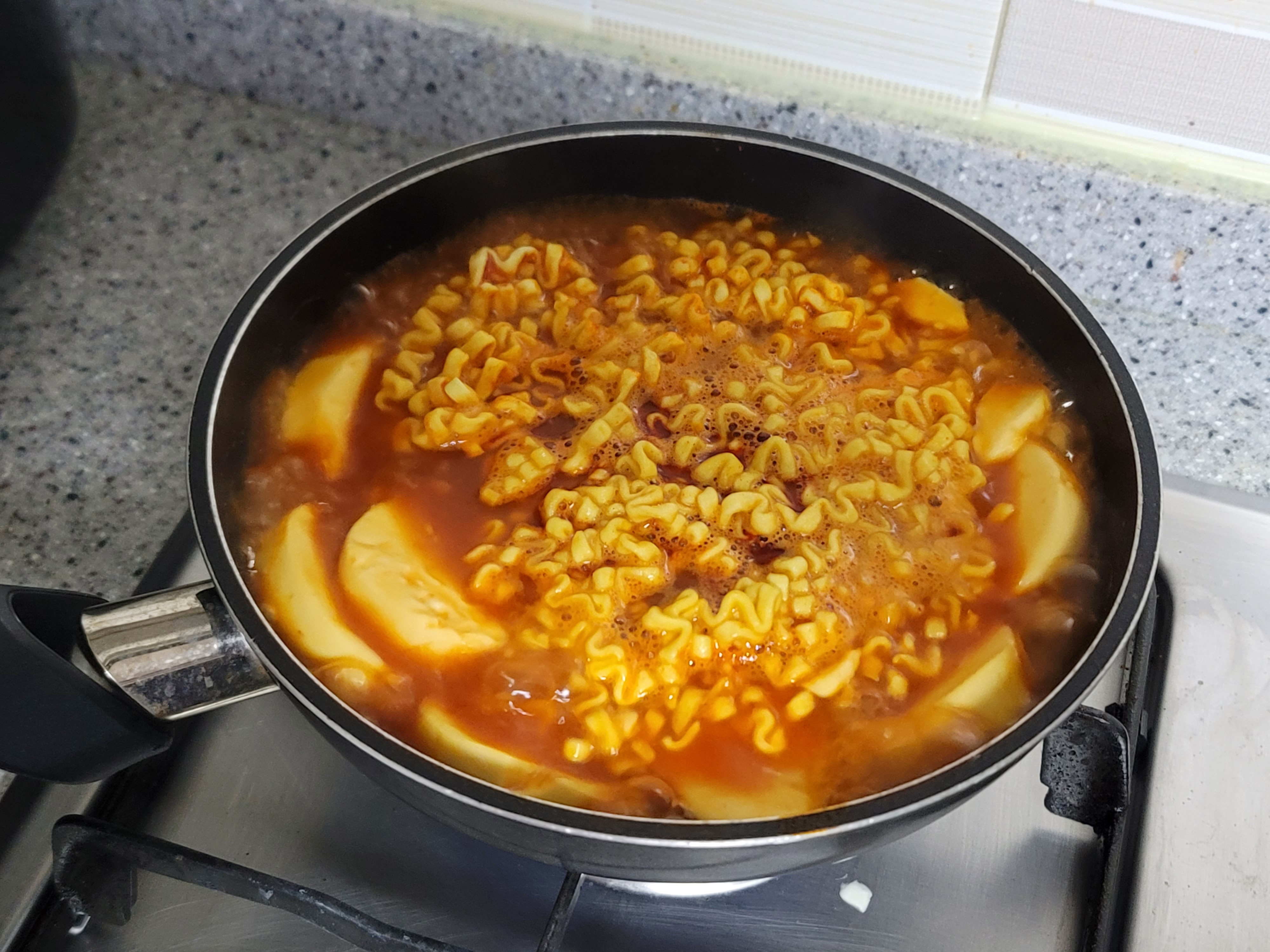 그리고 분말스프를 넣어서 한번 저어준 뒤 체다치즈를 올려주면 불닭볶음탕면치즈순두부라면 완성!