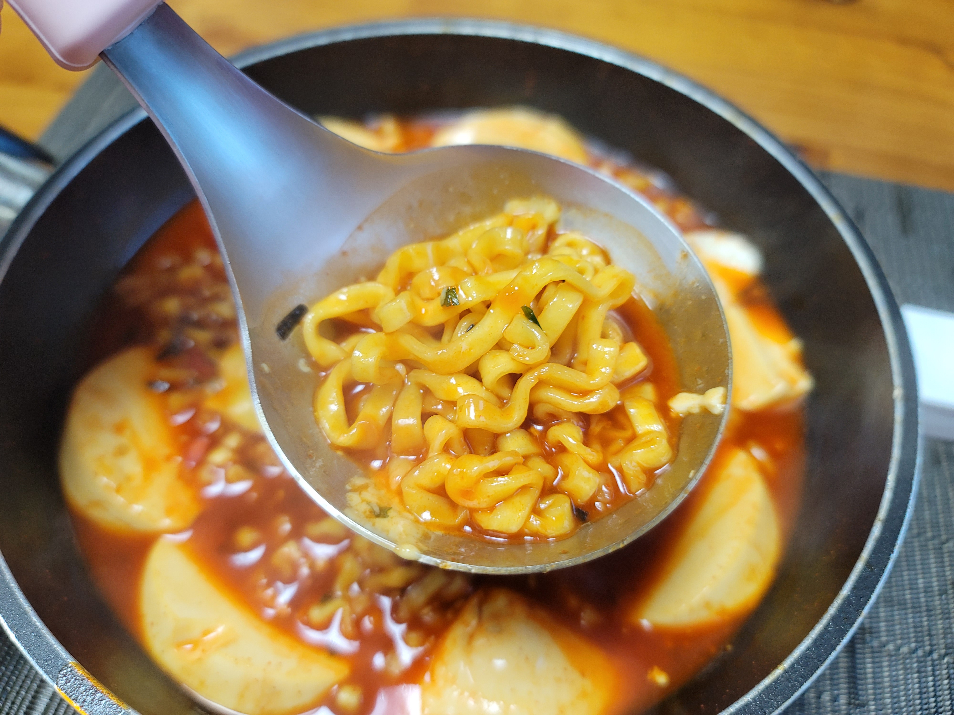 불닭볶음탕면의 매력은 확실히 요 면에 있는데요. 칼국수같이 넓쩍한면이 탱글하고 쫀득하고 식감이 너무 좋습니다.