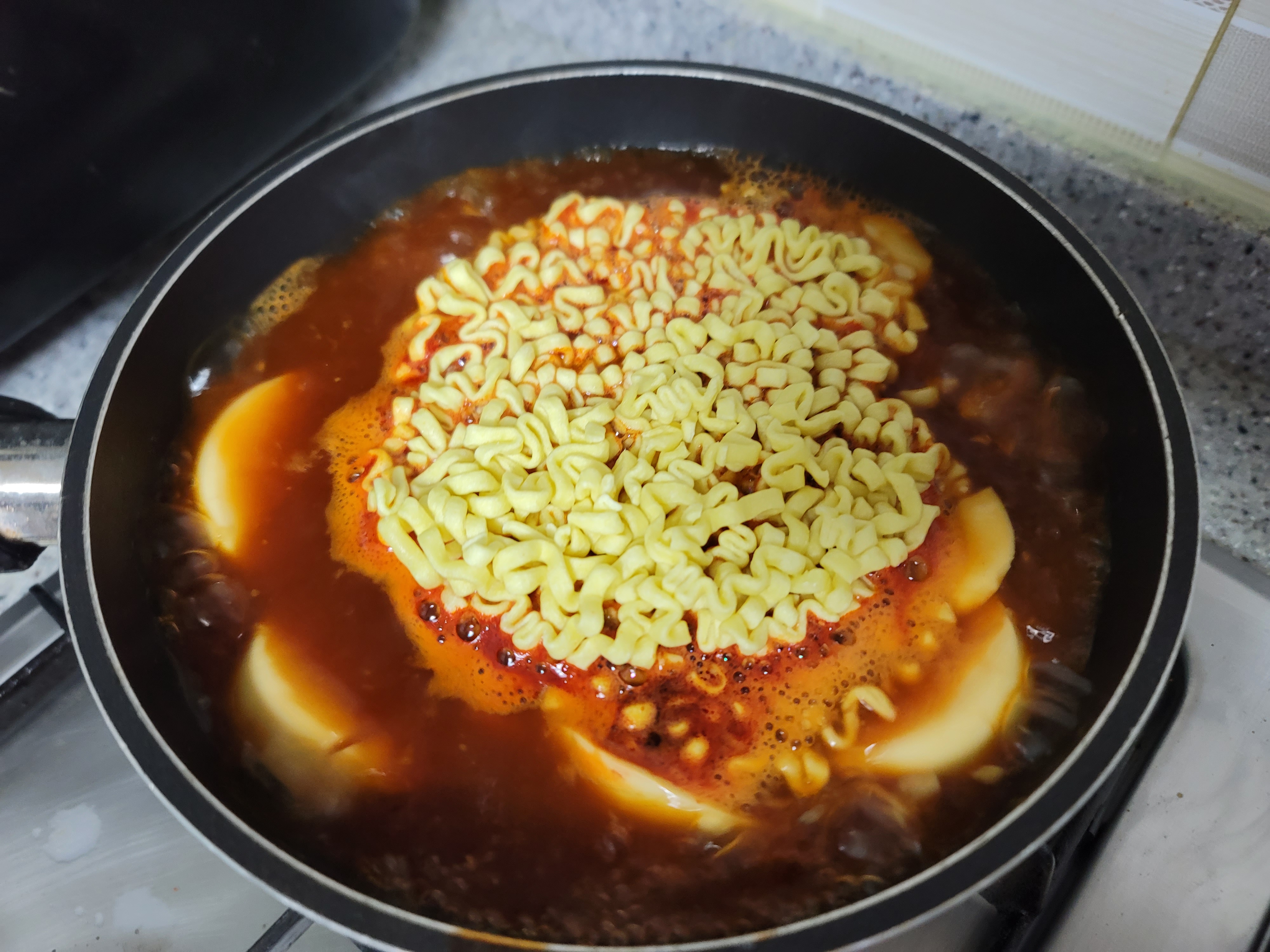 먼저 물을 500ml 넣고 액상스프를 넣고 물을 끓여줍니다.