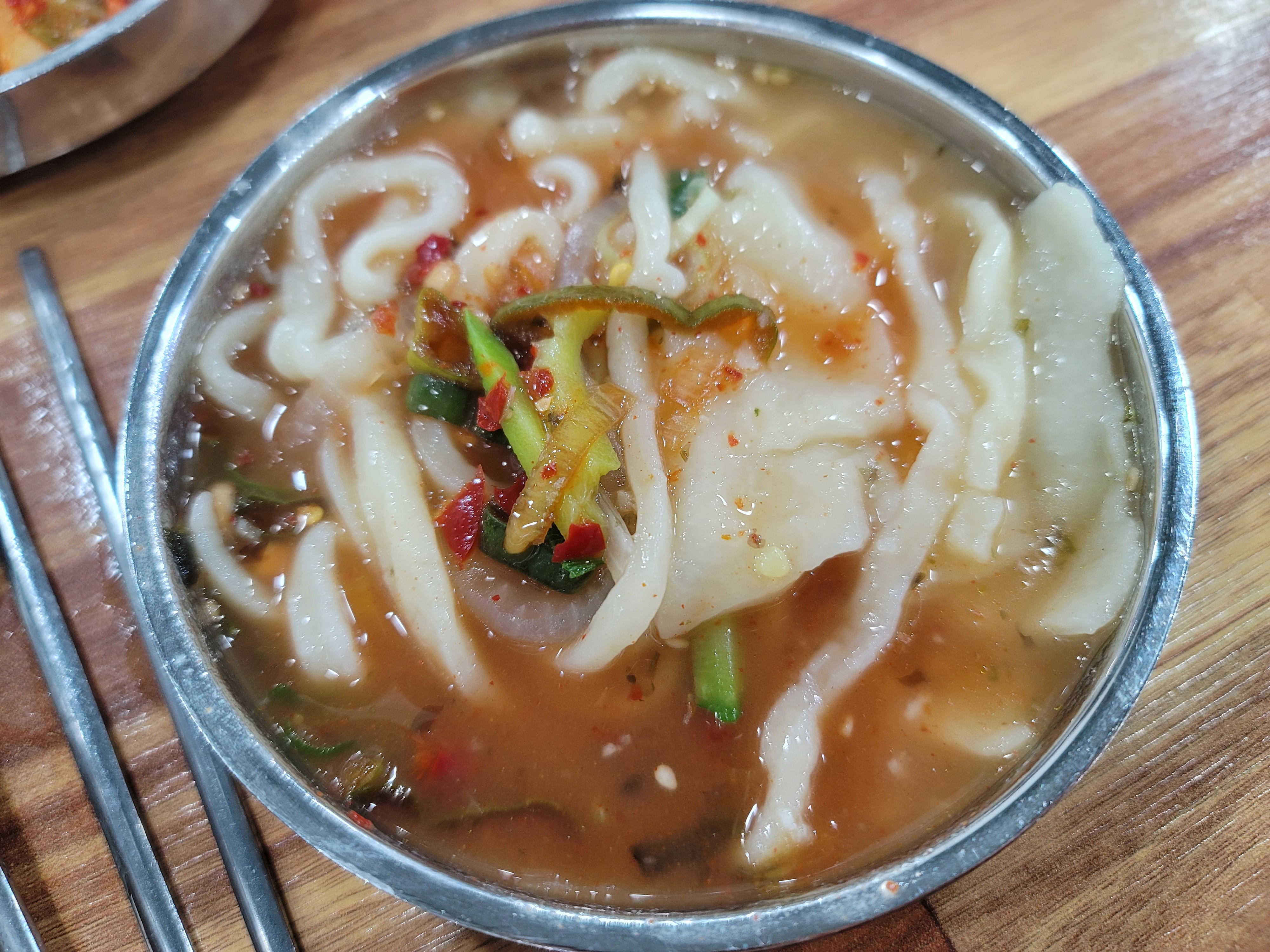안양 중앙시장 맛집 홍두깨칼국수 국물은 멸치육수베이스로 간간하고 감칠맛있어요. 애호박과 양파, 대파, 김가루가 풍미를 올려주기도 합니다.