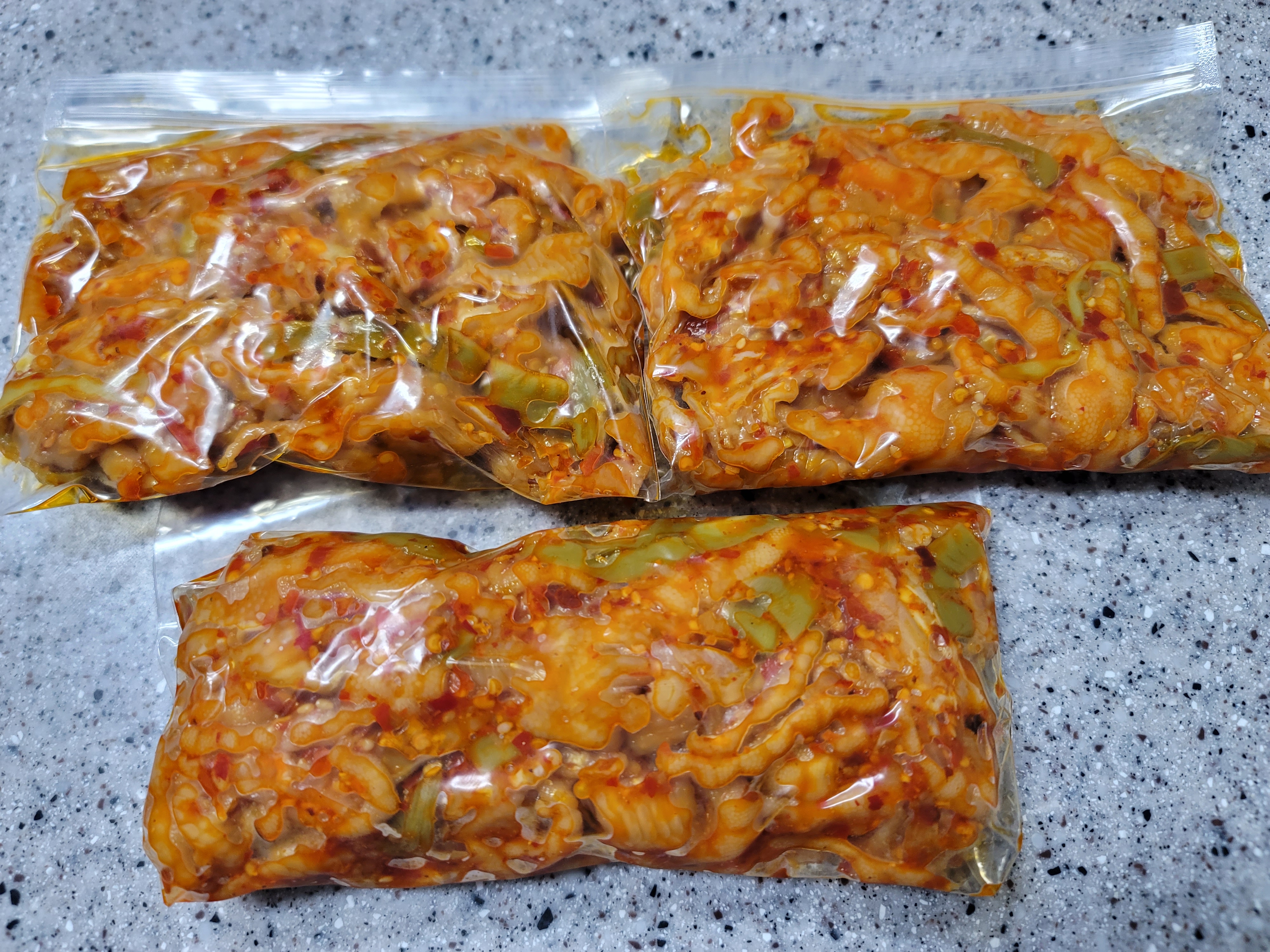 솔직히 오독함은 바로 오자마자 먹었던게 더 좋았던 것 같은데 먹다보면 뭔가 살짝 마른느낌? 양념이 진하지 않다보니 더 잘 베이지 않으면서 살짝 겉도는 느낌도 들었는데 일주일숙성해서 먹으니 이건 맛이 더 잘들었어요!! 그런데 숙성할때는 배송된봉지째해야 양념이 잘 베는 것 같아요. 첫봉지 먹었으면서 용기해 소분되어있었을때는 이렇게 양념이 베이지 않아거든요...
