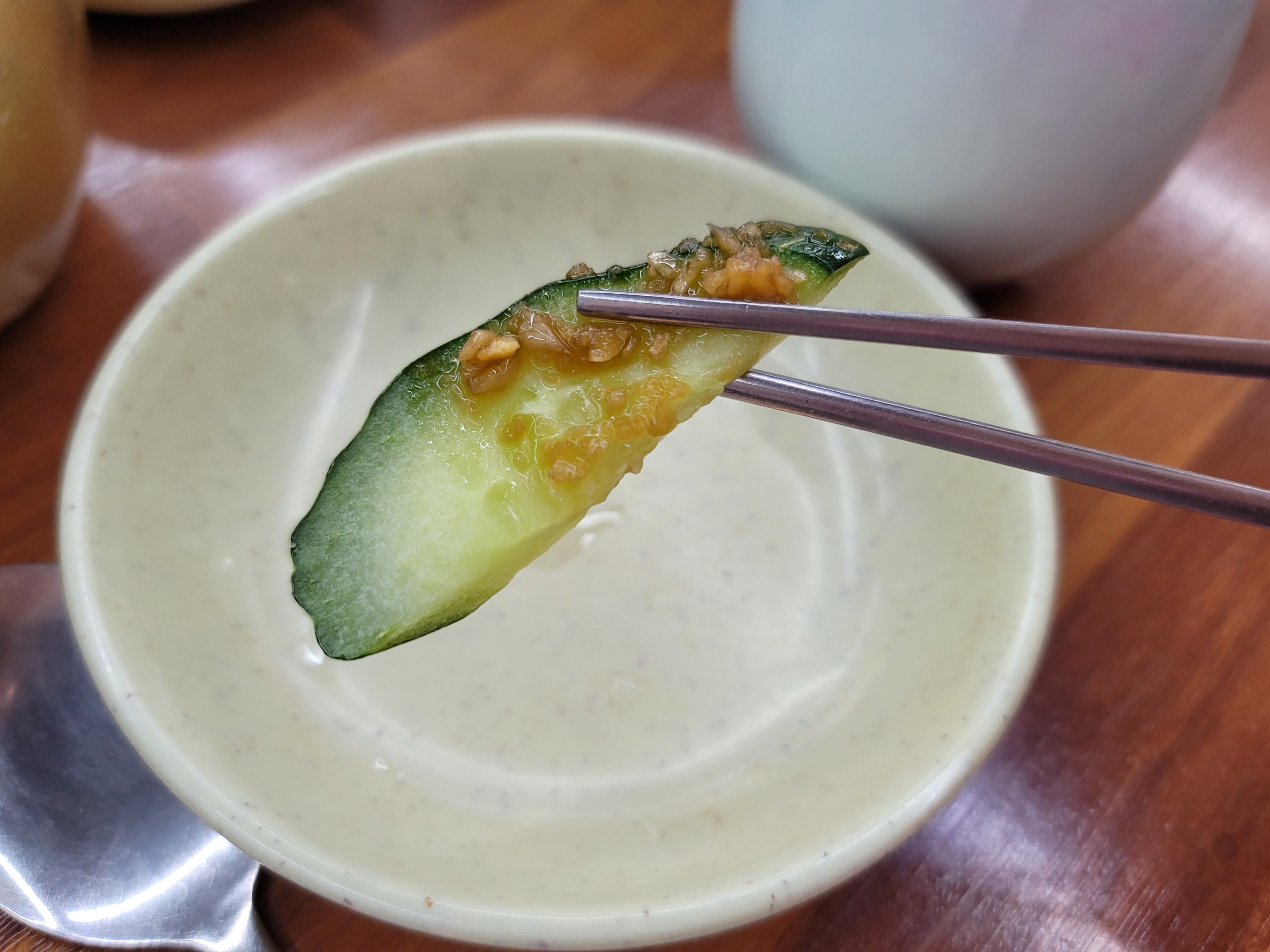 먼저 나온 왕만두~~ 사이즈가 엄청 큰느낌은 아니지만 피가 얇아서 소는 가득차있는 느낌이었어요. 그리고 기본찬으로 단무지와 오이에 양념올라간게 나오는데 요 오이가 또 요물이더라고요 ㅋㅋ 양념이 새콤달콤하면서 약간 마늘맛이 나는데 감칠맛이 너무 좋았어요!