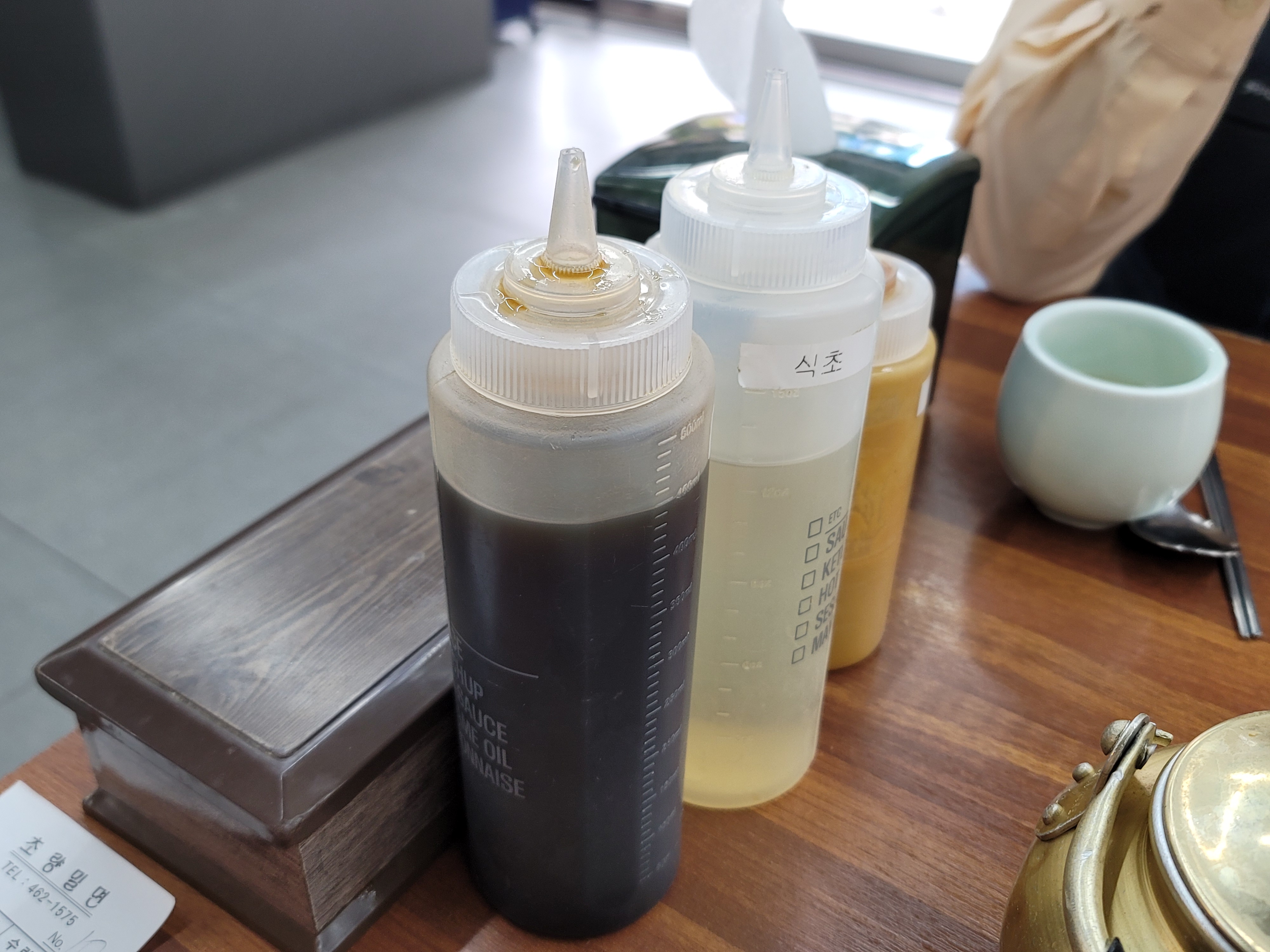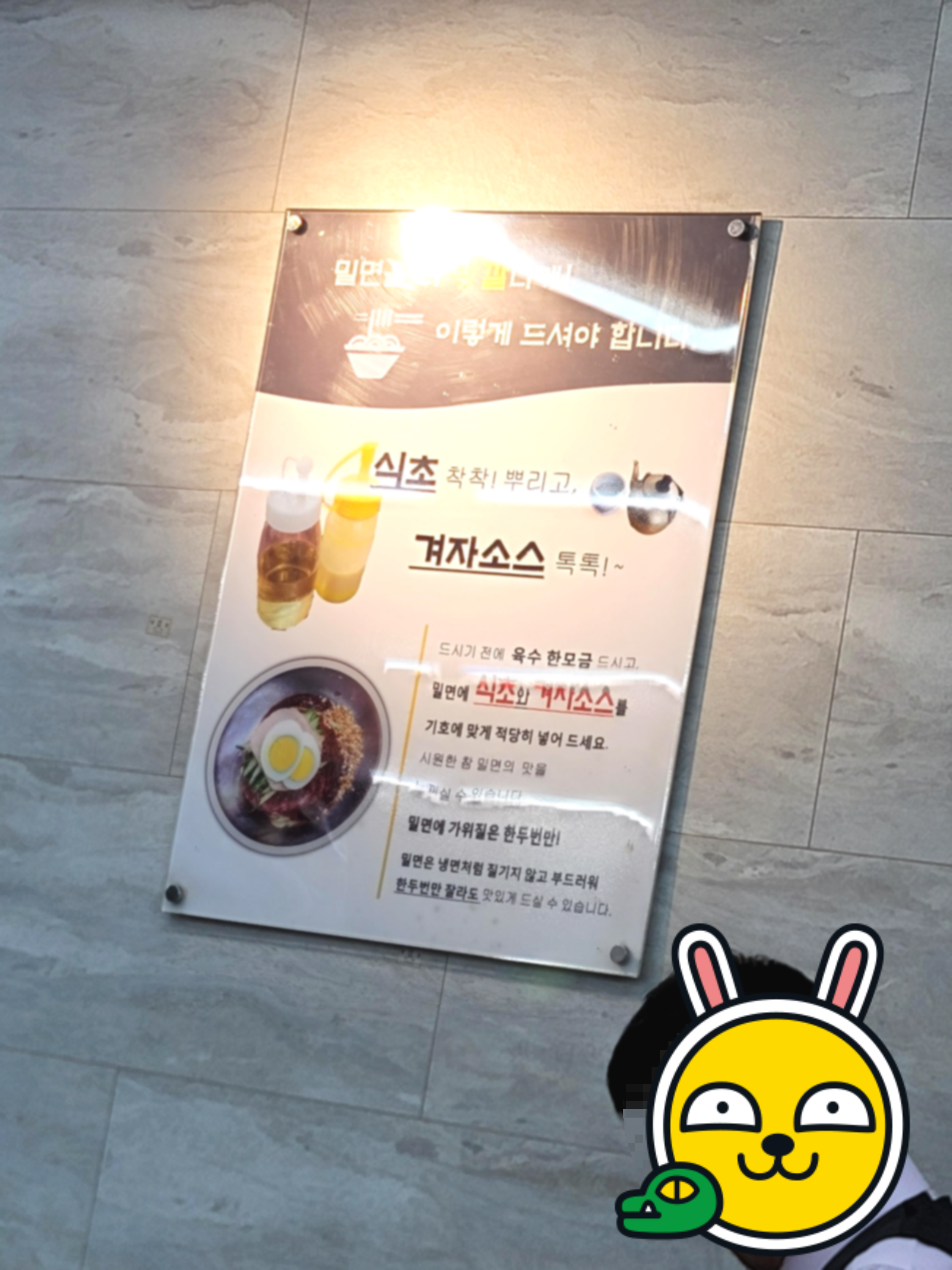 먹는방법이 적혀있어서 한번 봤는데요. 일단 육수 한모금 을 마시고 밀면에 식초와 겨제소스를 기호에 맞게 넣어서 먹으라고 적혀있었어요. 식초과 겨자는 테이블에 있었습니다.