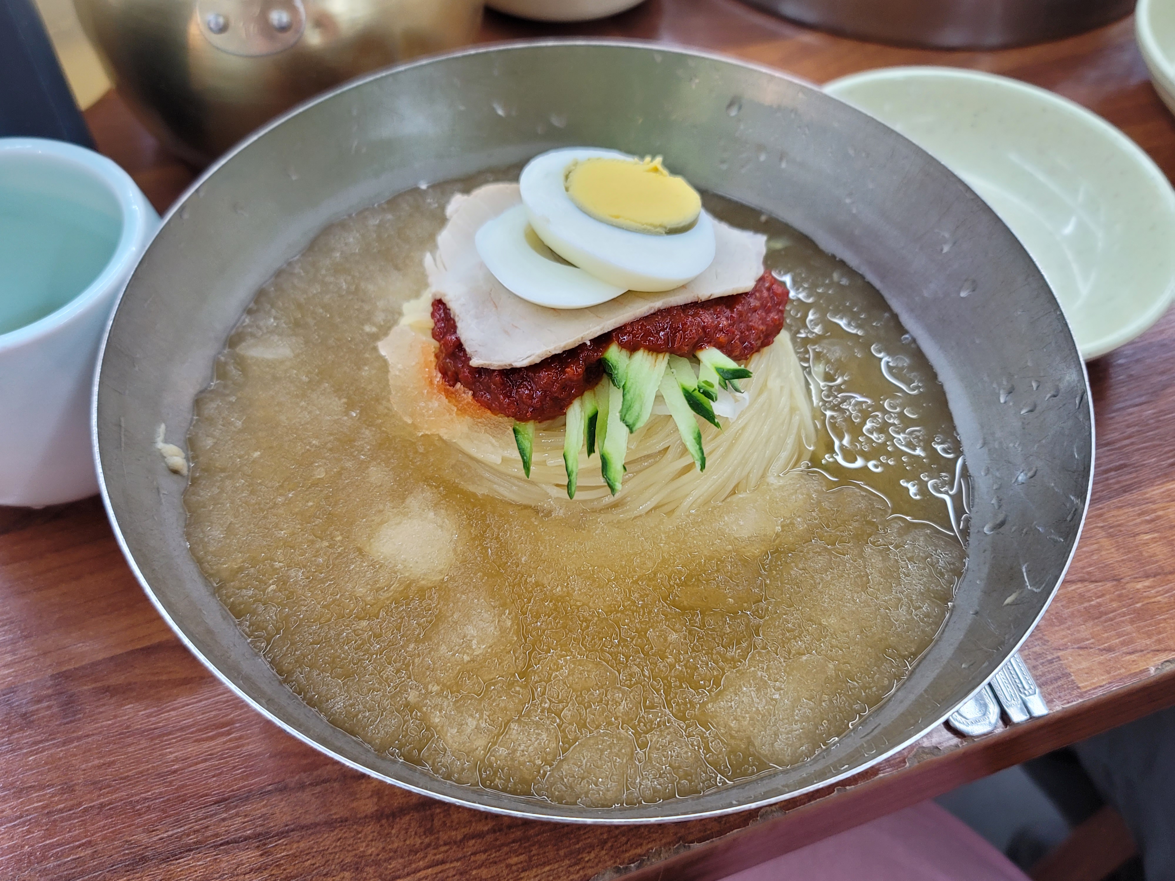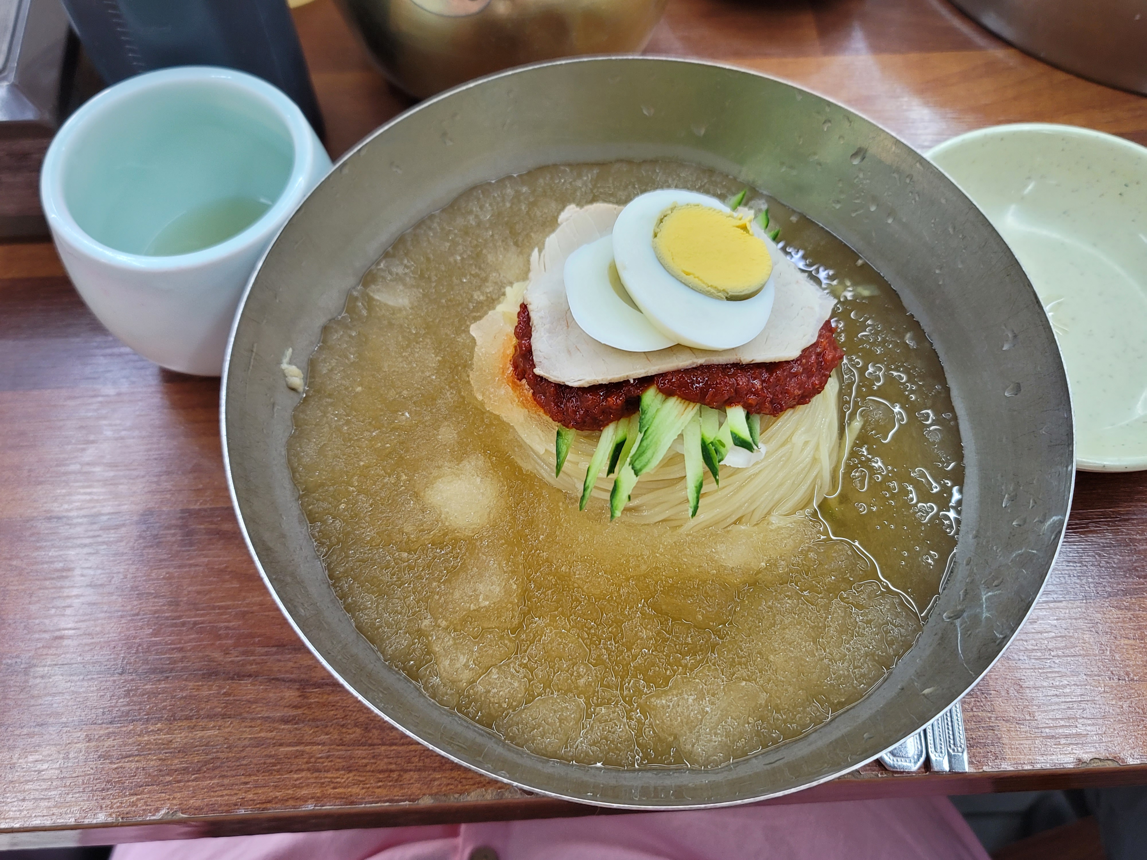 그리고 이게 바로 물밀면인데요. 살얼음 가득 떠있는 국물에 정갈하게 놓여있는 면과 수육,오이, 무절임, 계란토핑까지 이가격에 이런 비주얼 실화냐면서 감탄했어요ㅎㅎ