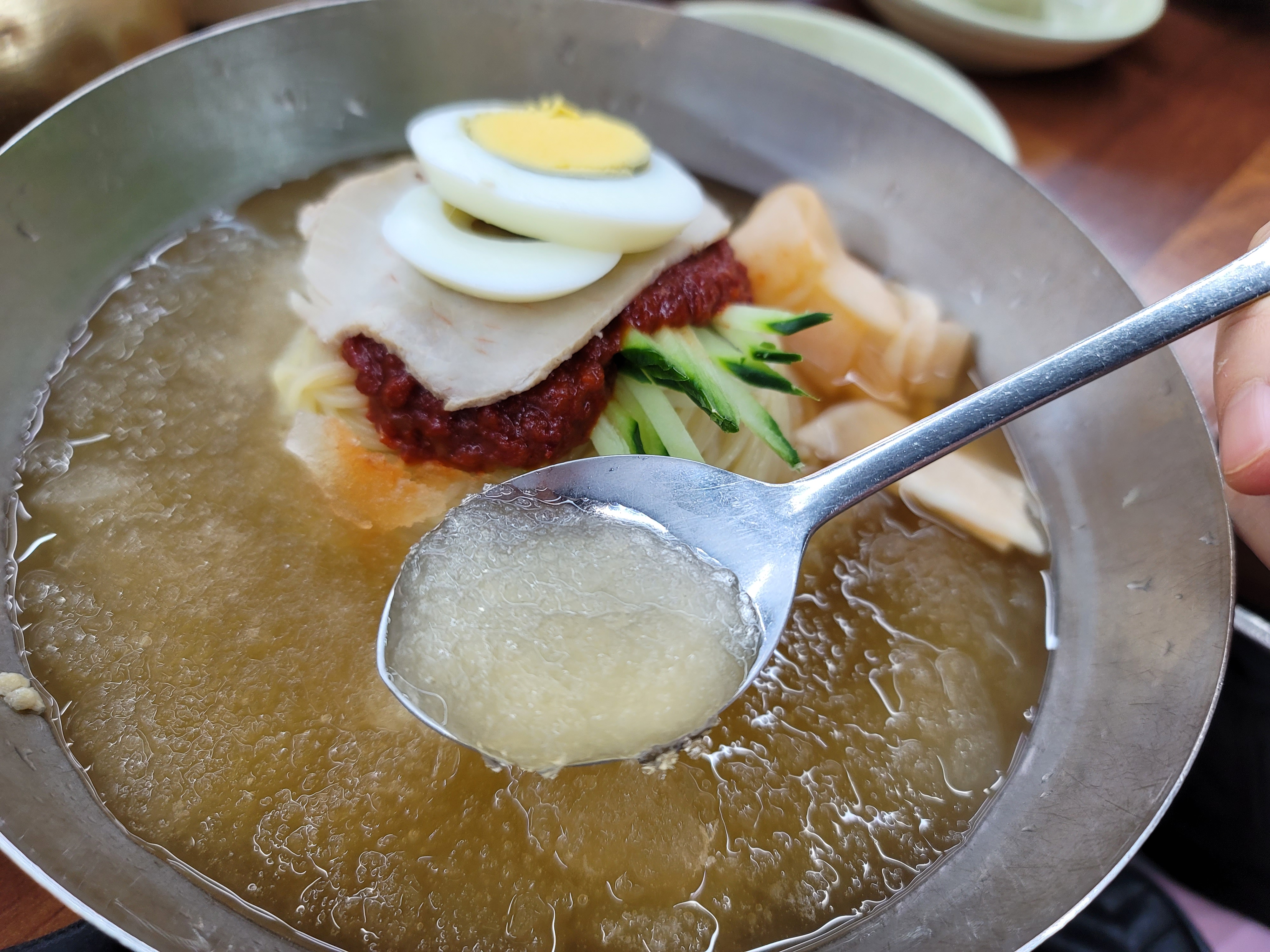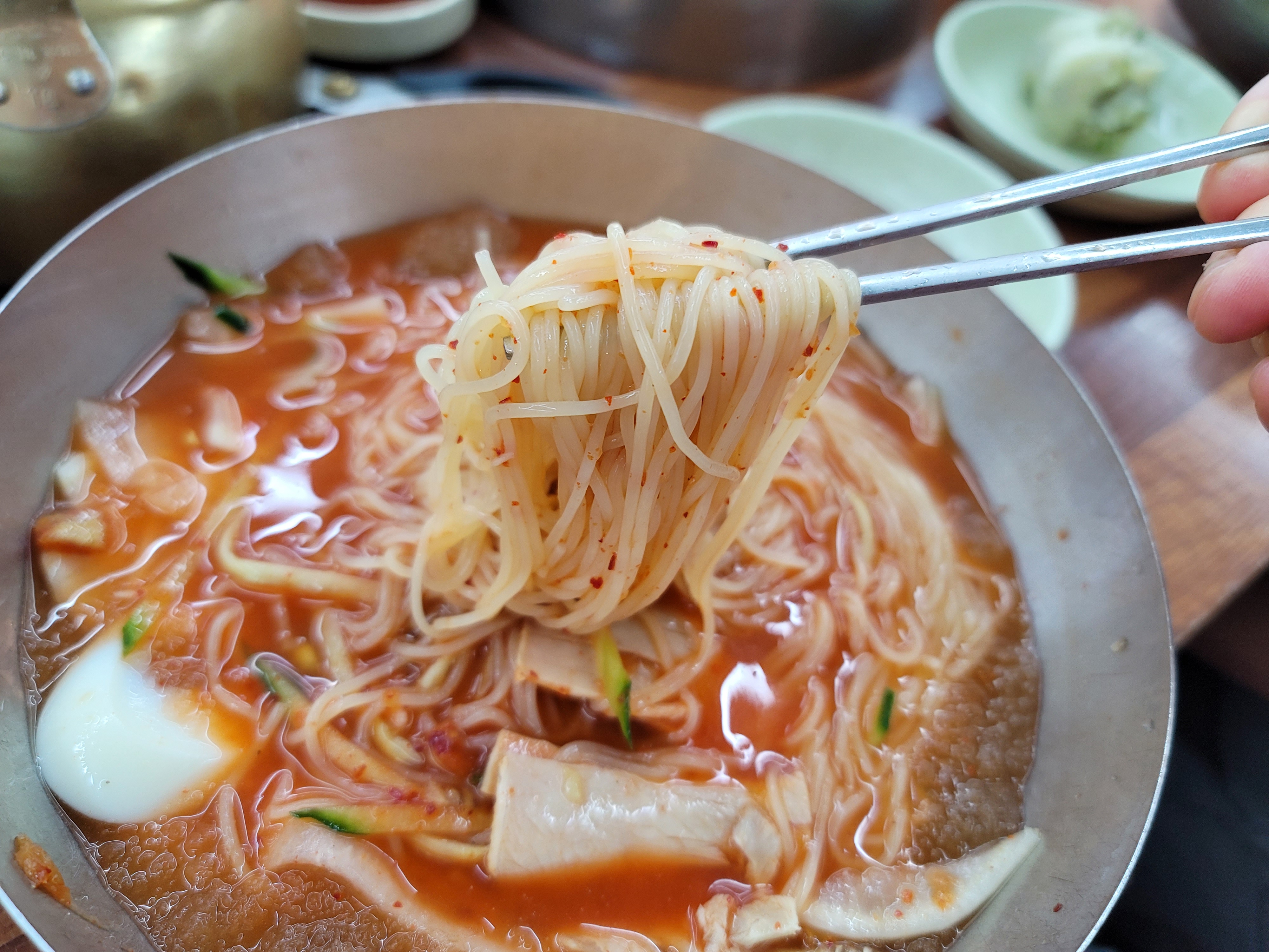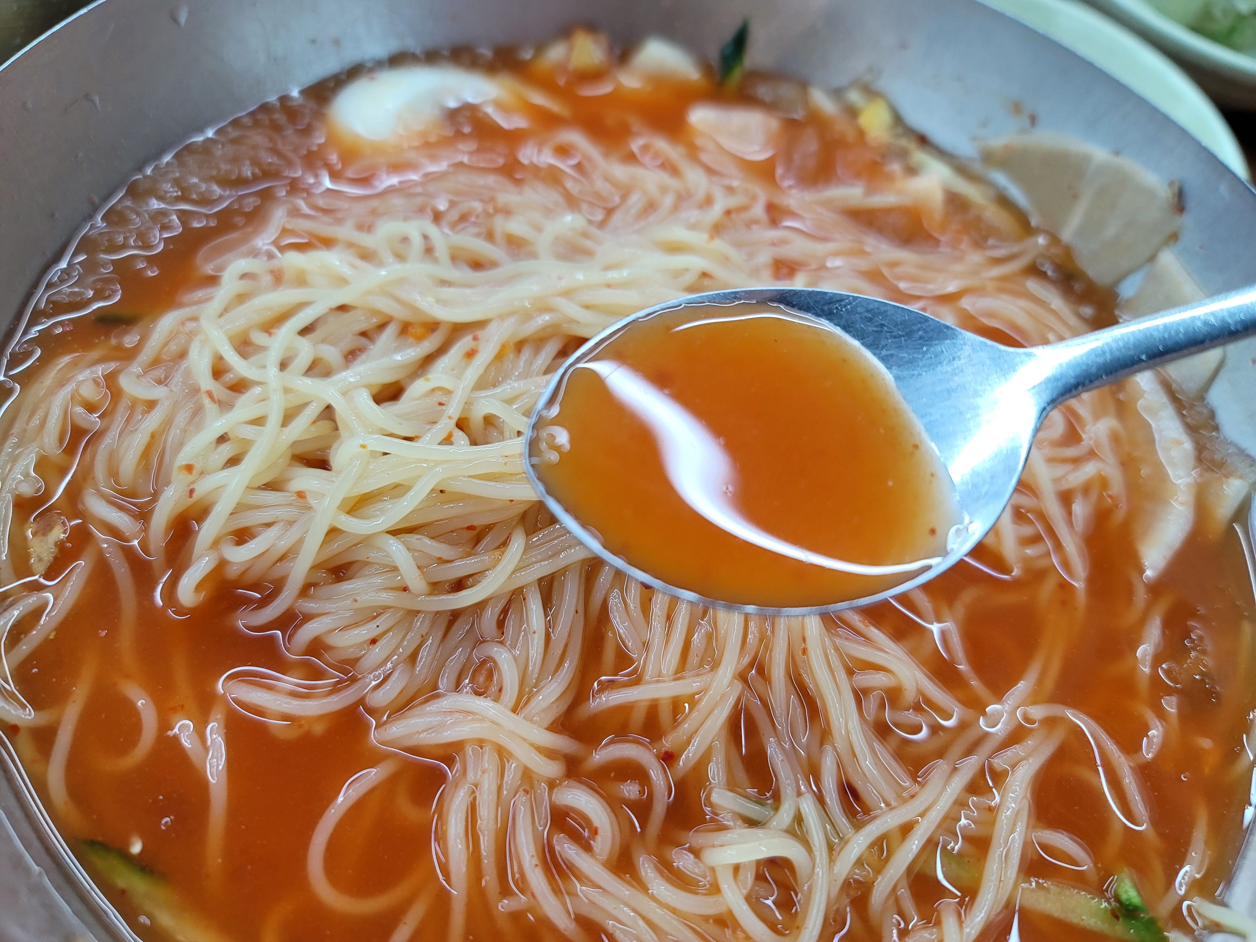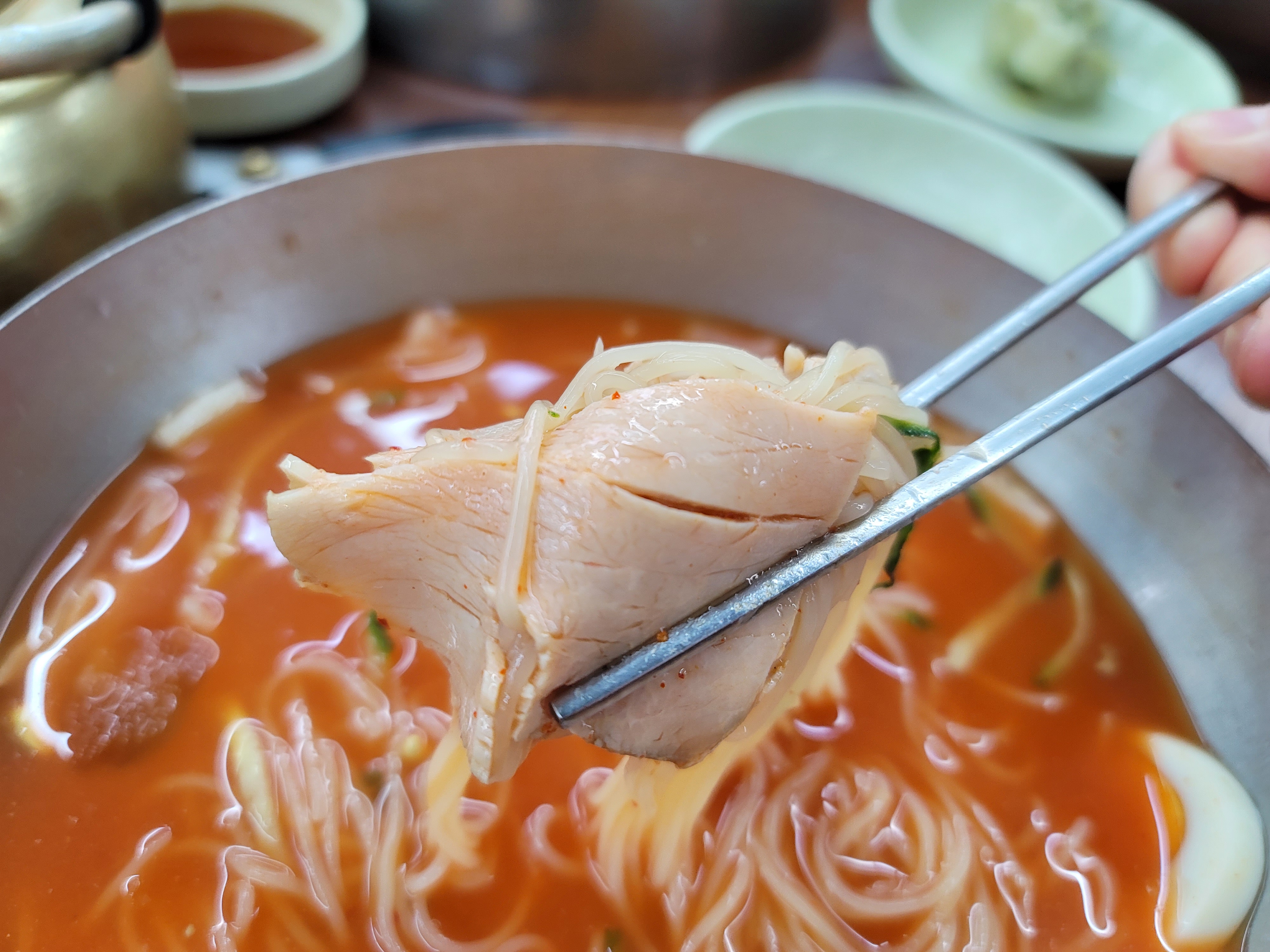 그리고 나서 국물을 먹어보니 확실히 다른맛!! 약재맛이 그렇게 많이 나지 않고 새콤달콤매콤하니 감칠맛이 너무 좋더라고요. 그리고 너무 들큰하지 않아서 뒷맛이 깔끔하다고 할까요? 면도 소면처럼 부드럽기만한게 아니라 탱글하면서 쫀쫀함도 있어서 식감도 좋았고 그렇다고 얇아서 치아로 끊어서 먹기도 좋았습니다.